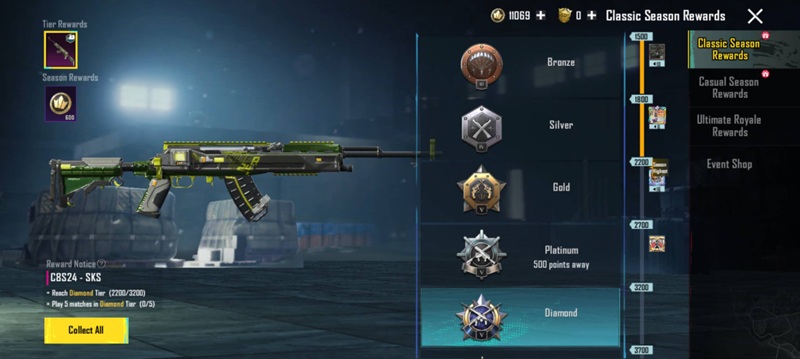 Pemain yang berhasil mencapai rank Diamond akan mendapatkan skin SKS eksklusif C8S24 setelah bermain lima kali di rank tersebut. Hadiah tambahan berupa 600 Season Token juga bisa diklaim.