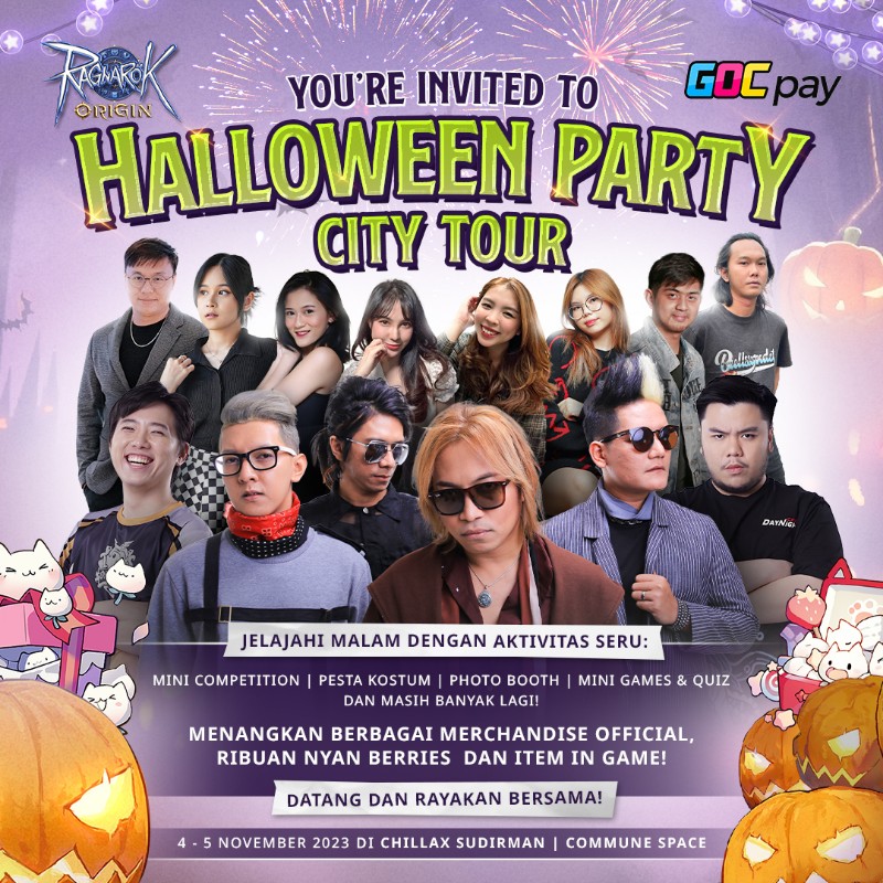 Momen Halloween tahun ini bakal lebih seru dan spesial karena akan ada acara Acara Community Gathering Party pertama kali di Indonesia yang diadakan oleh Ragnarok Origin. Jadi buat kamu para gamers yang ingin merayakan momen Halloween bersama teman-teman kamu jangan lewatkan acara Halloween Party City Tour yang akan diadakan di weekend ini tepatnya di tanggal 4 hingga 5 November 2023 di Chillax Sudirman Commune Space Hall Jakarta. Acara ini mulai dari jam 3 sore hingga jam 10 malam. Acara Ragnarok Origin Community Gathering Party ini didukung penuh oleh GOC Pay dan turut memeriahkan acara ini dengan kehadiran guest star band J-Rock.