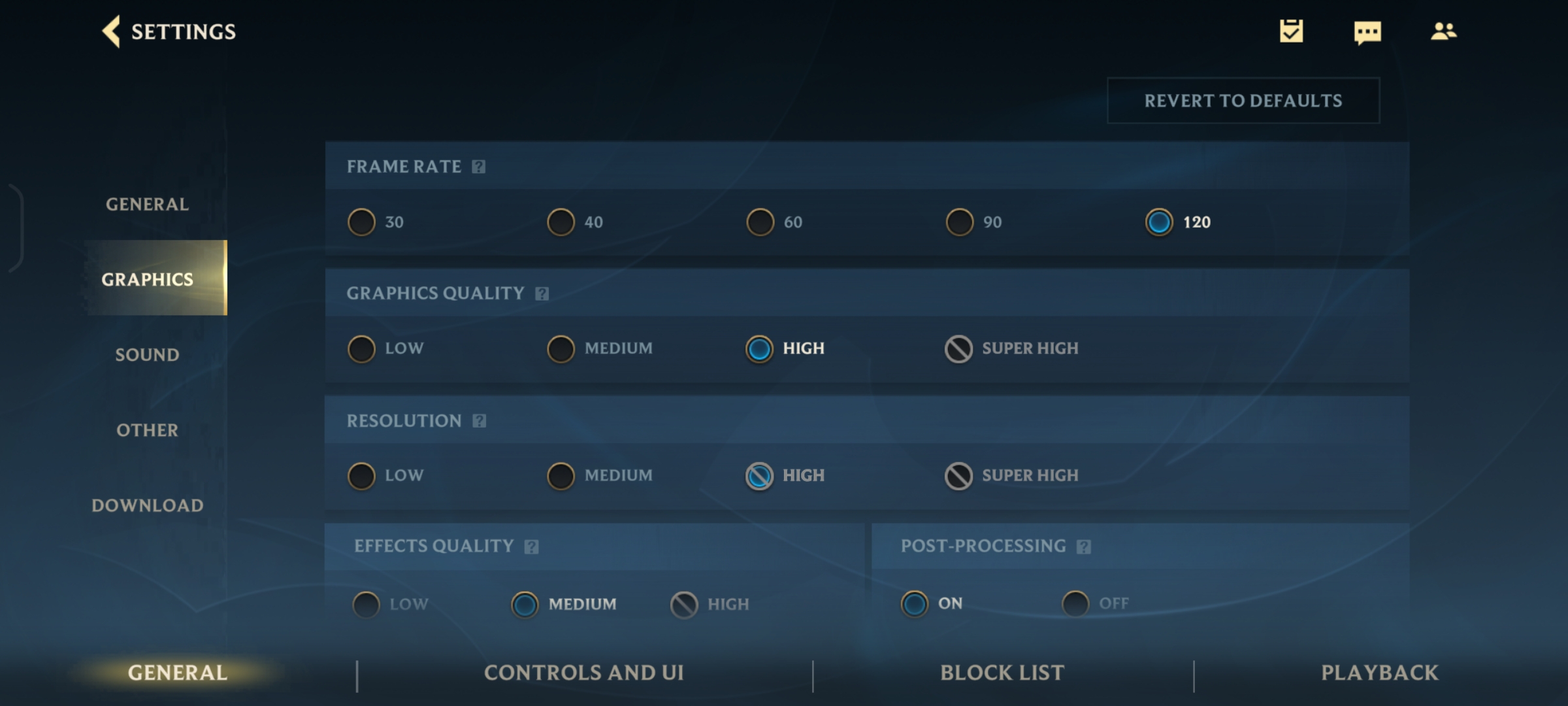 League of Legends: Wild Rift, game dengan grafis terbaik untuk game MOBA ini hanya mendapatkan opsi 120FPS medium setting dengan post-processing on. Riot Games masih belum memberikan opsi rata kanan untuk 120FPS, namun bisa diulik bilamana kamu menurunkan frame rate ke 60FPS. Average FPS untuk 120FPS medium setting adalah jelas 120FPS tanpa adanya stutter, namun ketika melakukan teamfight akan ada penurunan 2-5FPS. Konsumsi baterainya berada di 10 persen per match.