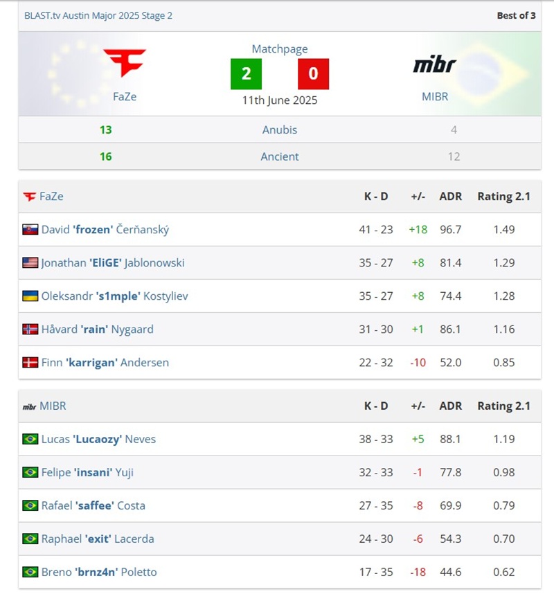 Håvard "rain" Nygaard memastikan kemenangan dengan double entry frag, membawa FaZe menang 2-0 dan melaju ke Stage 3.