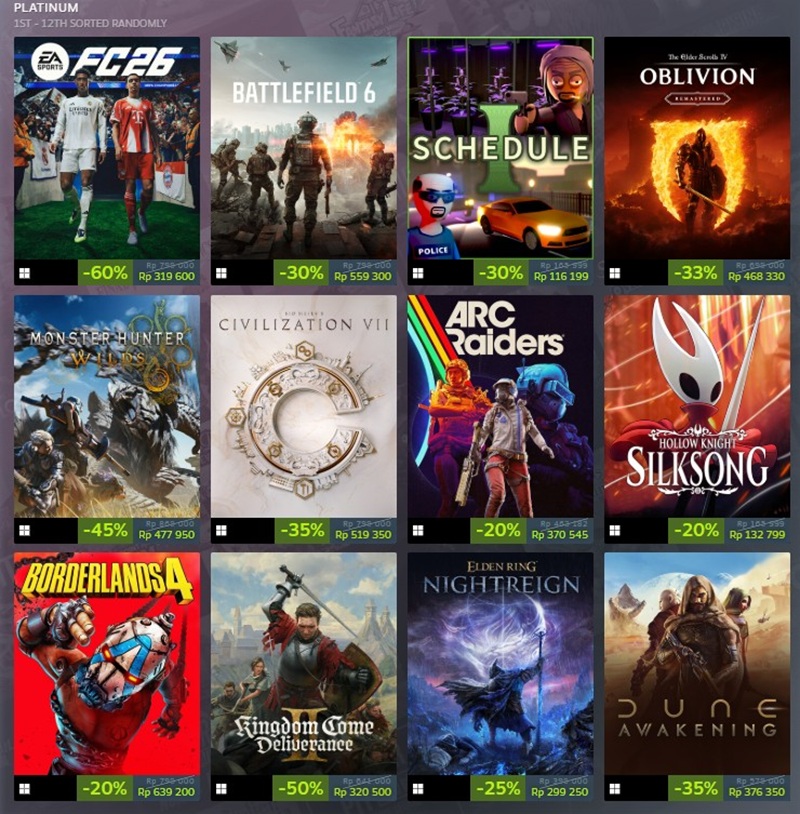 Dalam kategori New Releases of 2025, Steam menampilkan game-game baru yang mencatatkan performa luar biasa sepanjang tahun. Untuk kategori Platinum, sejumlah judul besar seperti Elden Ring: Nightreign, Battlefield 6, Hollow Knight: Silksong, Monster Hunter Wilds, hingga Borderlands 4 berhasil mencuri perhatian.