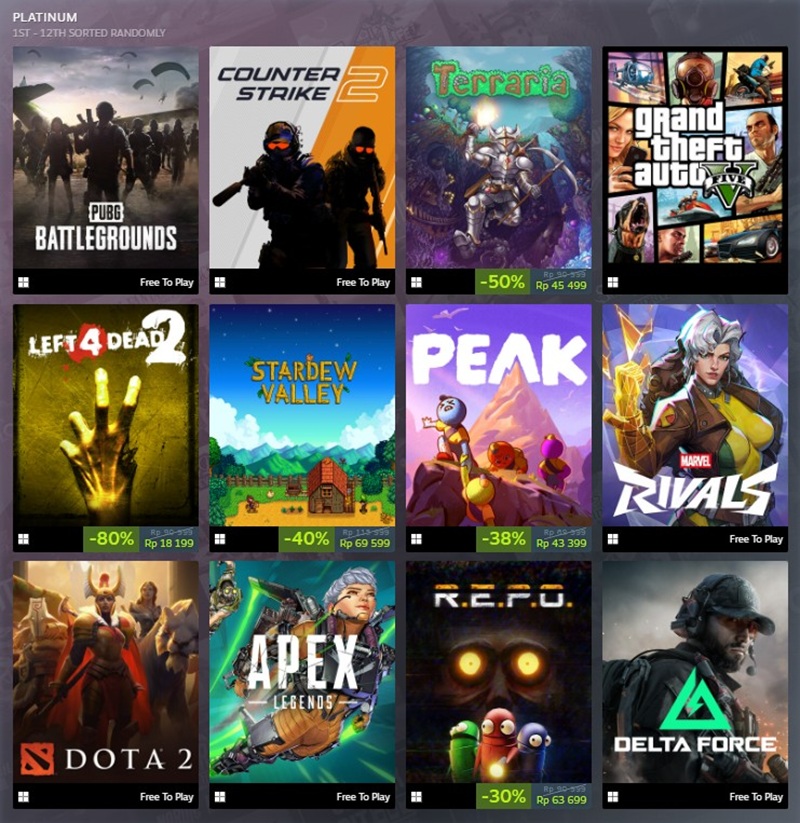 Steam juga mengungkap daftar Most-Played Games of 2025 berdasarkan jumlah pemain aktif. Game seperti DOTA 2, GTA V, Stardew Valley, Terraria, Counter-Strike 2, dan Marvel Rivals masuk kategori Platinum, menandakan daya tarik jangka panjang yang luar biasa.
