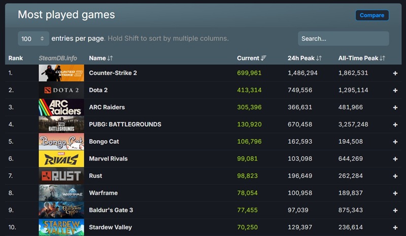 CS2, Dota 2, hingga Arc Raiders Dominasi Steam Charts