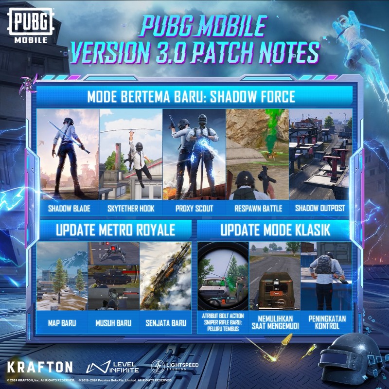 PUBG MOBILE meluncurkan pembaruan Versi 3.0 dan merilis mode bertema terbaru Shadow Force mulai 9 Januari 2024. Selain mode game bertema baru, akan ada pembaruan baik di mode Klasik maupun Metro Royale yang menjanjikan pengalaman bermain PUBG MOBILE yang lebih seru!