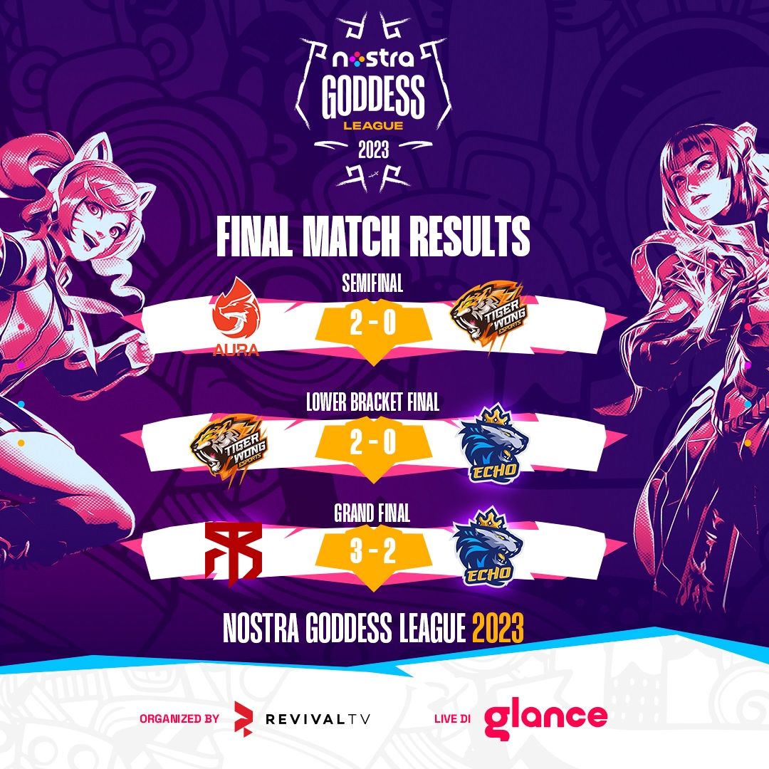 Dengan pertandingan para tim yang sangat luar biasa di babak playoffs, berikut ini adalah tim-tim yang berhasil mendapatkan gelar juara di Nostra Goddess League: