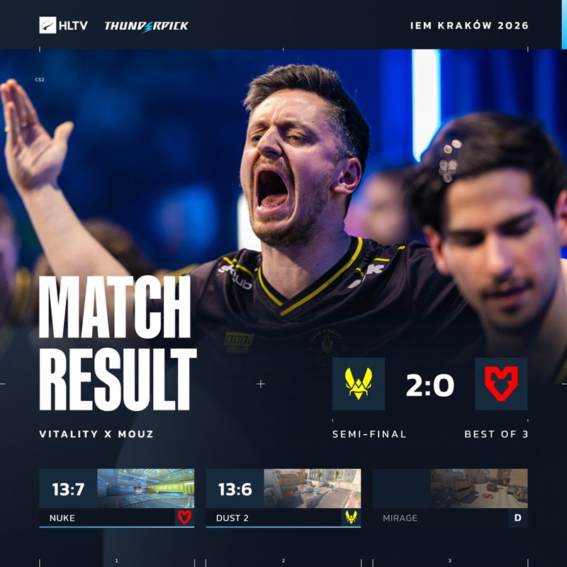 Team Vitality memastikan satu tempat di grand final IEM Krakow 2026 setelah menumbangkan MOUZ dengan skor 2-0 pada babak semifinal. Vitality tampil dominan sepanjang seri dengan kemenangan di map Nuke (13-7) dan Dust2 (13-6), sekaligus memperpanjang dominasi mereka atas MOUZ dalam beberapa tahun terakhir.
