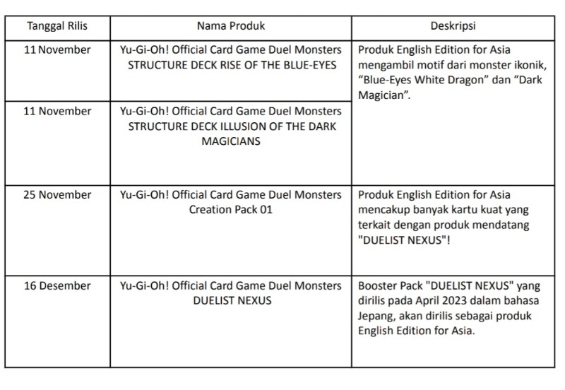 Konami Digital Entertainment Limited (KONAMI) mengumumkan bahwa rangkaian produk dari Yu-Gi-Oh! Official Card Game (OCG) English Edition for Asia telah resmi diluncurkan hari ini (11 November). Yu-Gi-Oh! OCG English Edition for Asia tersedia di Thailand, Singapura, Malaysia, Hong Kong, Taiwan, Filipina, dan Indonesia. Daftar lengkap distributor resmi produk baru juga tersedia di website resmi Yu-Gi-Oh! OCG.